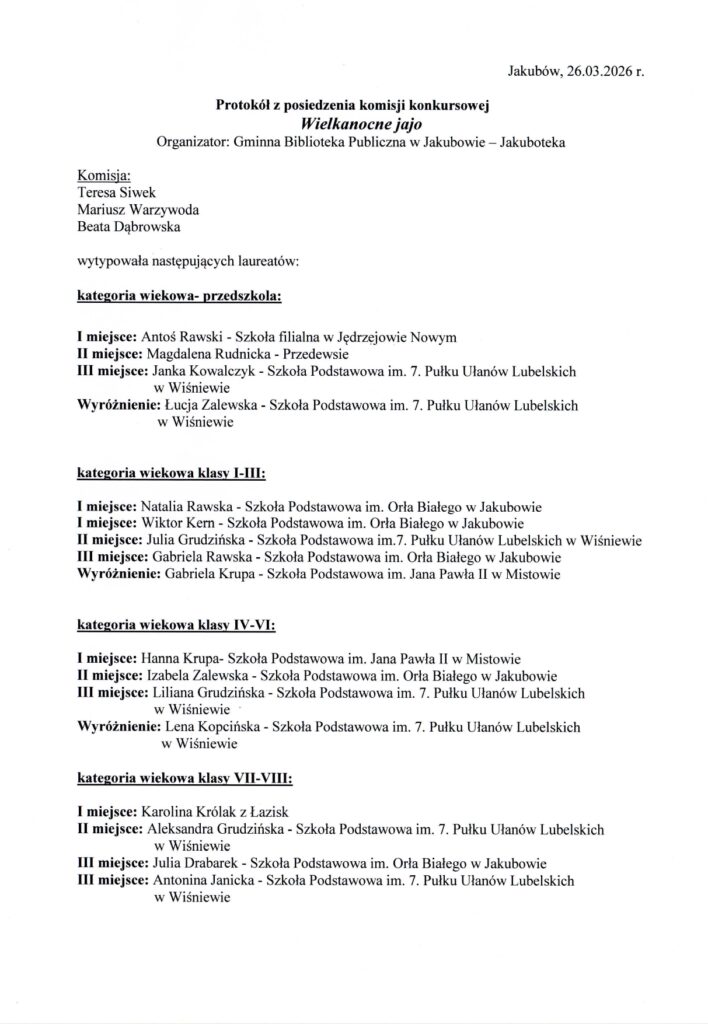 Konkurs gminny „Wielkanocne Jajko” zgromadził prace wielu utalentowanych uczestników, którzy poprzez swoje dzieła pokazali, jak bogata i różnorodna może być tradycja związana z okresem Wielkanocy. W wydarzeniu wzięły udział dzieci, młodzież oraz dorośli, a każda z zaprezentowanych prac wyróżniała się pomysłowością, starannością wykonania oraz indywidualnym podejściem do tematu. Prace zostały wykonane różnymi technikami. Ta różnorodność pokazała nie tylko kreatywność uczestników, ale także to, jak tradycja może być interpretowana na wiele sposobów, łącząc elementy dawne z nowoczesnymi.