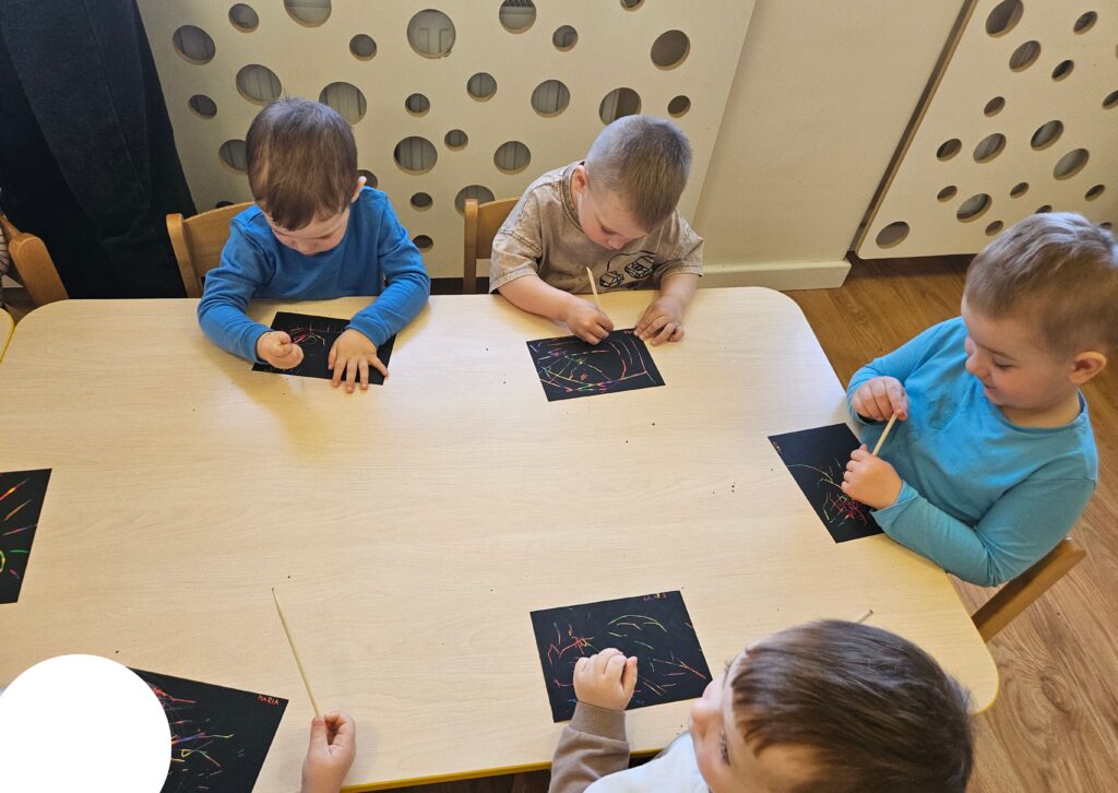 To był miło spędzony czas z najmłodszymi. Dzisiejszy ranek spędziłyśmy w towarzystwie dzieci ze żłobka Akademia Malucha w Jędrzejowie Nowym. Naszym celem było pokazanie maluszkom, że biblioteka to też miejsce pełne magii i niespodzianek. Odkrywaliśmy wspólnnie świat poprzez kształty i rozmiar – ogromne księgi zachwycały rozmiarem, a te najmniejsze idealnie pasowały do małych rączek. Opowiadałyśmy magiczną historię obrazami dzięki teatrzykowi Kamishibai oraz rozbudzałyśmy kreatywność, tworząc magiczne wydrapywanki.